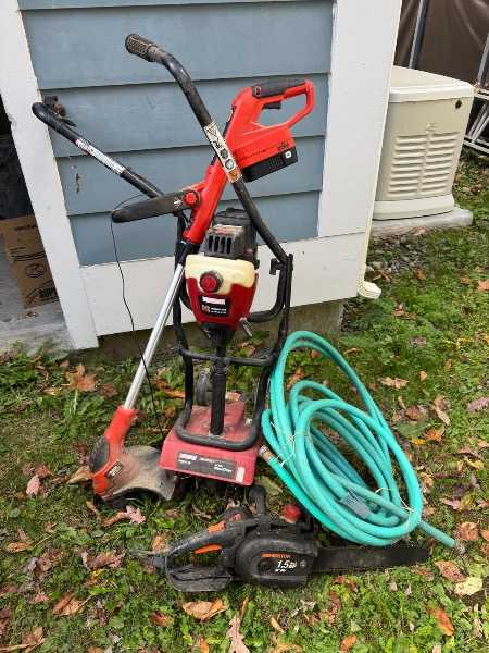 Lawn and garden items, each with problems. Chainsaw may work but unknown. It was not used much but sat in shed for decades. Tiller handles broken. Weed whacker slow engine and maybe other issues