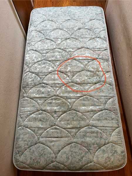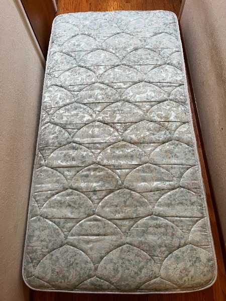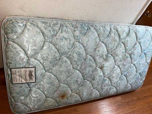This is a single bed mattress. 78" x 38" x 9" Many years old, but in decent condition. As you can see in the pics, there is a large, hard to see stain on the front. Marked in one picture. And some smaller stains on the back. House is smoke-free, but we have pets.