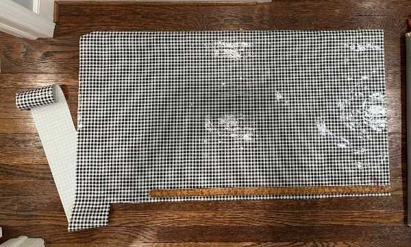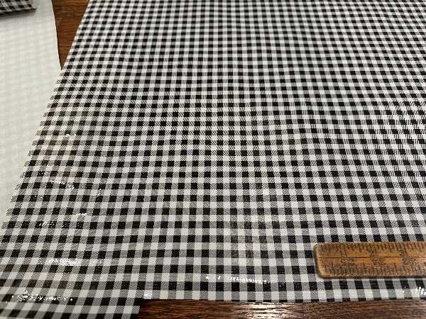 Black & white checked oilcloth. New/never used. Approx 1 yard. Exact dimensions: 47" L x 26" W, plus a "tail" of extra fabric (visible in photo).