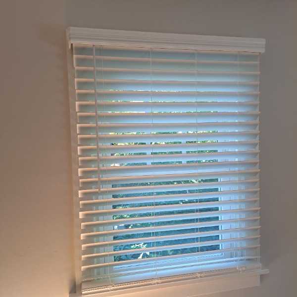 White window blinds , wide slats, wood look