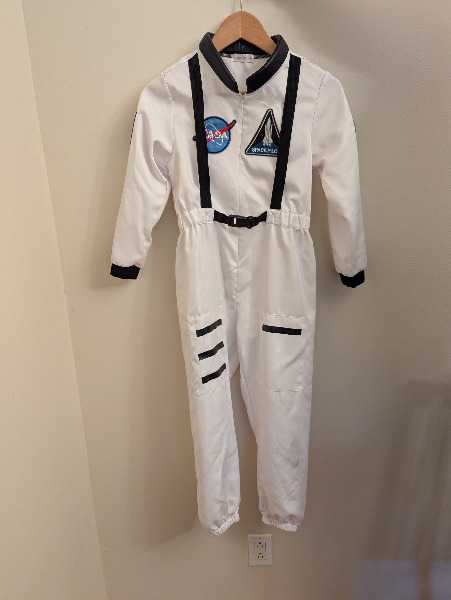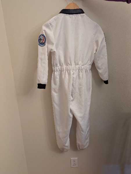 Kids' astronaut suit for Hallowe'en. Size indicated in photo, but our son wore this when he was 10. We no longer have the helmet we made to go with this, so it's just the suit.