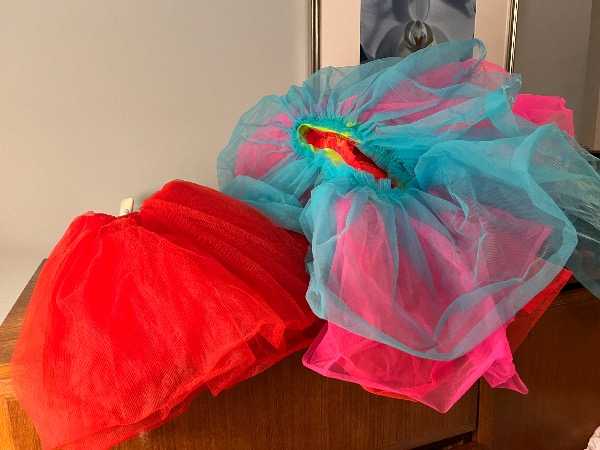 One multicolor tutu with elastic waistband and two single color items. Please indicate pick up time if you're interested in this item