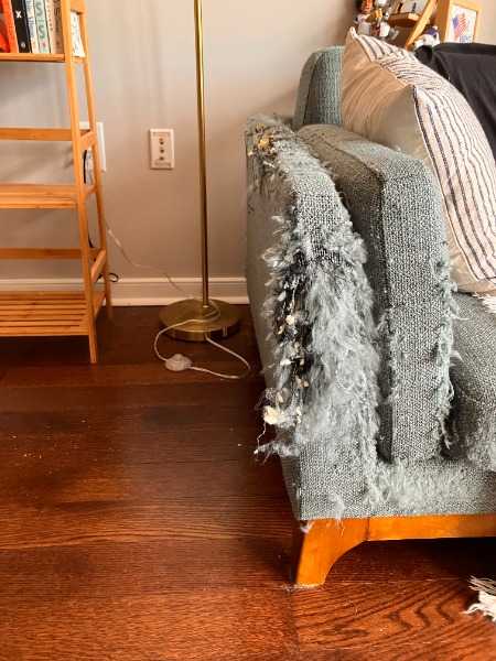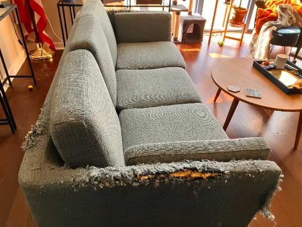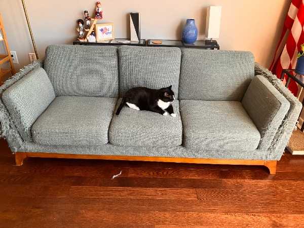 This is the Ceni 83" sofa by Article (https://www.article.com/product/25712/ceni-83-sofa-buckler-ivory) in a discontinued color. It's still plenty comfortable, but it needs to be reupholstered. (If I'd gotten the cat before the couch, I would have gotten a couch made out of a different fabric.) You must pick it up, though there's an elevator in the building.