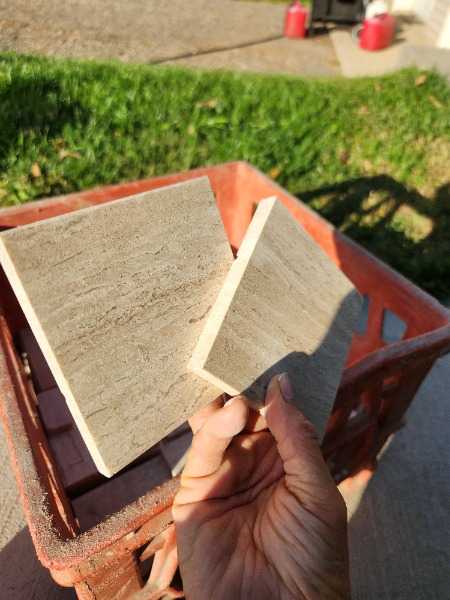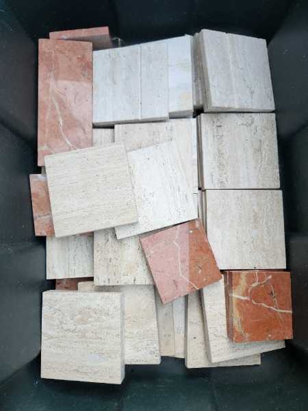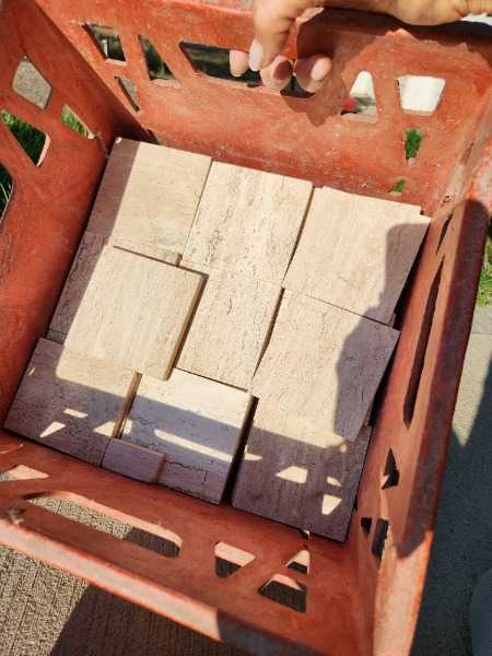 In red crate- 90 tiles, 3-3/4" sq Travertine stone tiles