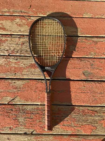 Wilson brand. Probably 20+ years old but still returns the ball!