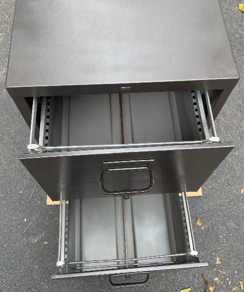 Pre-owned 2-drawer painted metal filing cabinet. Measures approximately 15"W x 26 1/2"D x 29"H. Holds standard letter-sized hanging folders. Painted finish is an almost black brown. If interested, please ensure vehicle can accommodate its size and that you have adequate manpower to load it.