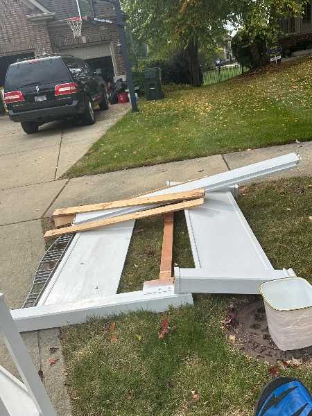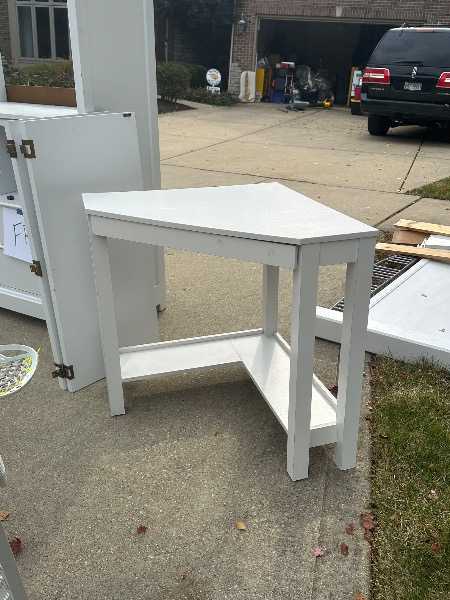 White wood Queen headboard, armoire, corner desk, plastic pool, metal deck tiki lights, baby gate, backpack