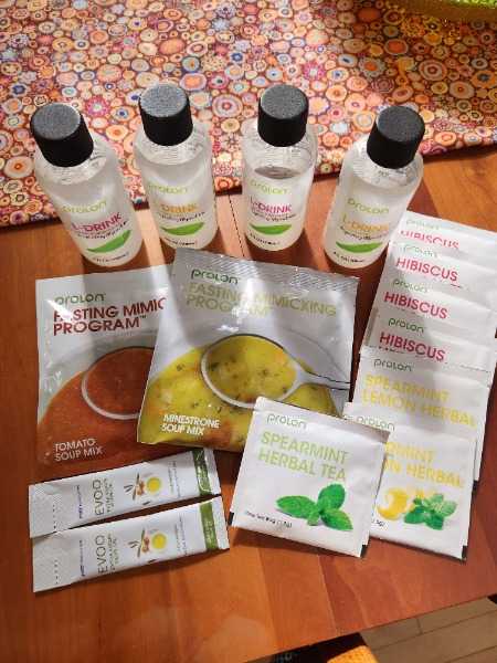 I have leftover items from a Prolon Five-Day FMD (fast mimicking diet) kit from the fast I just completed. I have: 4 bottles of L-drink (half full); 2 soup packets; 2 olive oil packets; 4 hibiscus tea packets; and 3 spearmint tea packets.