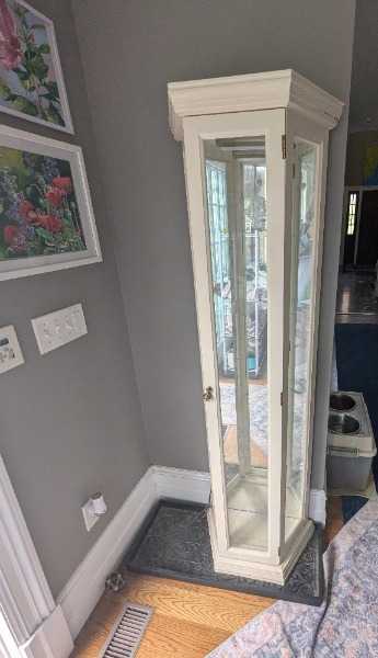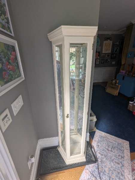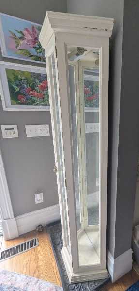 Flat mirror back, removable glass shelves. Solid painted wood frame.  Electric light fixture in "ceiling".  Approximately 70" tall 20" wide at back.