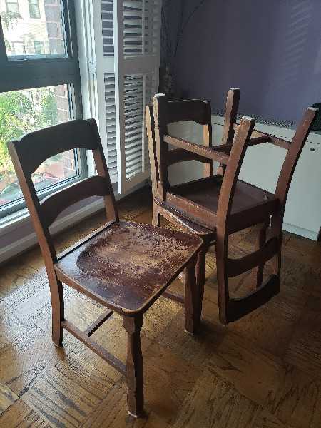 Four wooden chairs (three pictured), Shabby Chic aesthetic; distressed. Possibly other matching furniture available if interested.