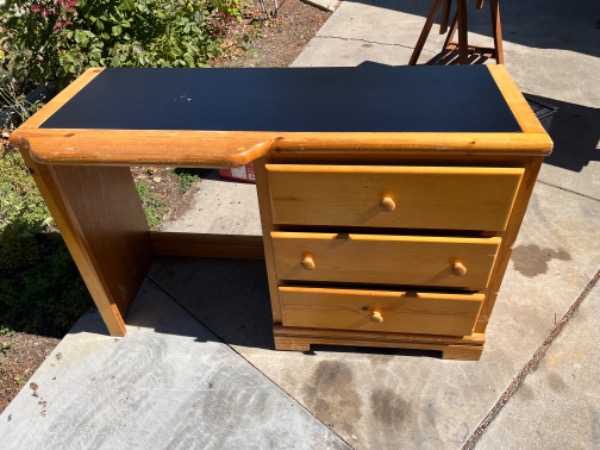 Desk and a dining room table available. One 3 drawer student desk and one dining table with two leafs (can be as small as 42"x42" or as large as 42"x62"). Student / craft desk, will post dimensions asap but roughly 22x34. Sold wood, not fiberboard or pressboard. Table has been used for crafts so has some scratches and paint on the surface.