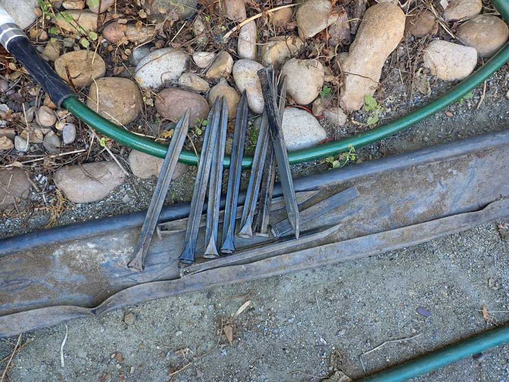 Black plastic flexible edging for garden or lawn, 5 inches high by about 30 ft long, wiht plastic stakes. Dirty (it's been in the soil!) but in good condition.