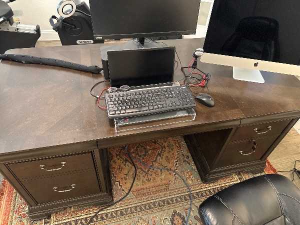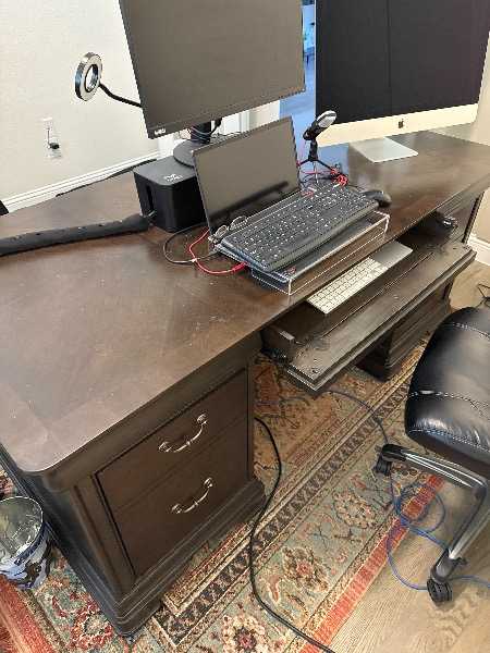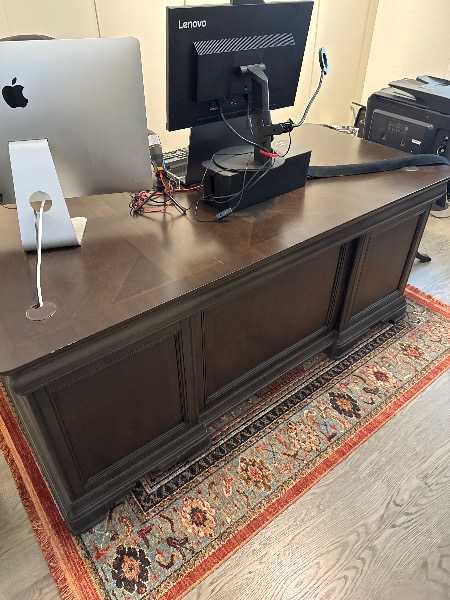 Large, solid wood executive-style desk in excellent condition. Very sturdy and heavy, with beautiful dark wood paneling and tons of workspace.