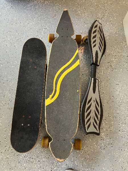 2 old style skateboards and one ripstik