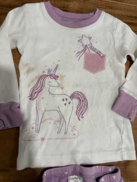 Could you use a couple of pairs of pajamas that you won’t mind your little one learning to feed herself breakfast in?  Perfect for your messy little eater! (As these do have some staining from breakfast.)