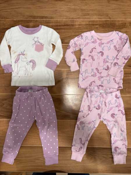 Could you use a couple of pairs of pajamas that you won’t mind your little one learning to feed herself breakfast in? Perfect for your messy little eater! (As these do have some staining from breakfast.)