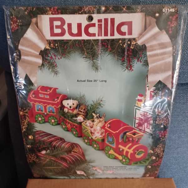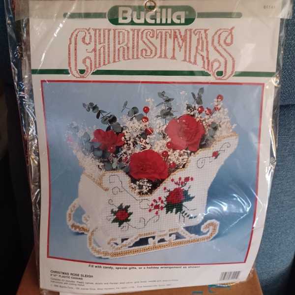Two Bucilla Christmas plastic canvas kits.  The train is unopened.  The sleigh is open, but all the parts are in it.