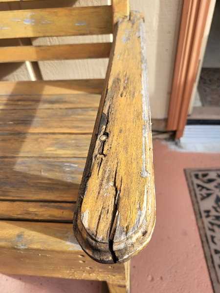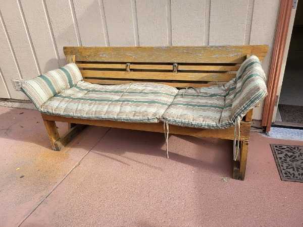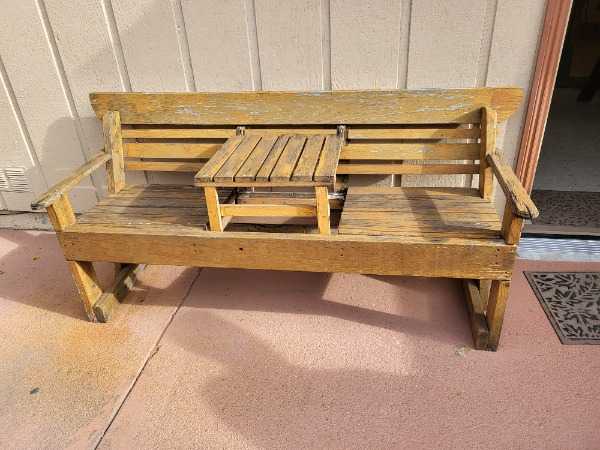 Outdoor wood bench. Seating area 5 1/2 ft. Overall length 6 ft. Center section can be lifted to make a table. Some of wood is cracked and finish is worn.
