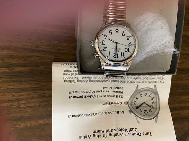 This is a "talking watch" used for the Visually Impaired, Made by Time Optics. Originally used by my Dad. I'm certain it WORKS, BUT needs a new battery and I can't get the battery compartment open. I'm sure a Jeweler could. Also band is broken, new ones are cheap. For pickup in Palatine