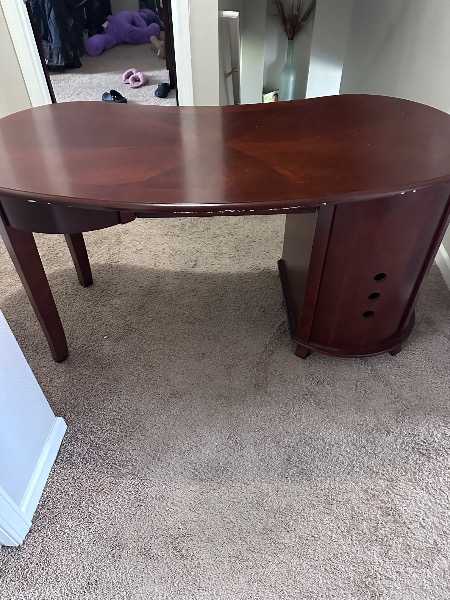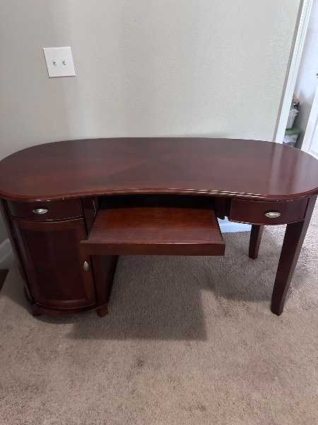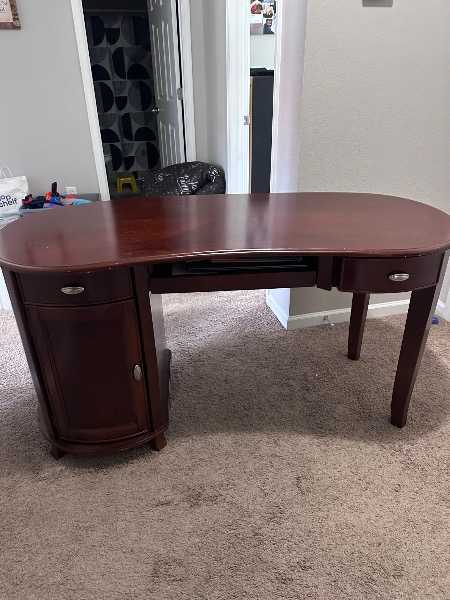 Heavy great quality desk. A few scuffs and marks. Feature two drawers and a cabinet to house an tap CPU or storage. Will need two people to transport.
