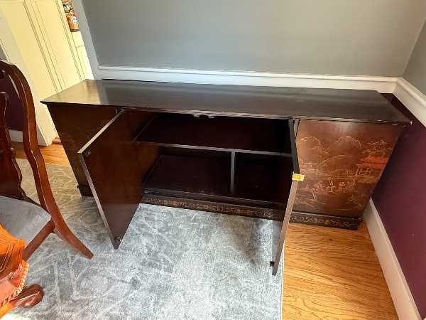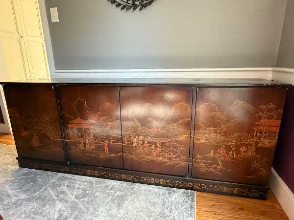 Large (75"W X 29"H X 18"D) wood buffet with Asian-themed design on front doors. At least 70 years old and well loved over the years. Heavy. No delivery or loading assistance available but it is in the garage for easy pick up.