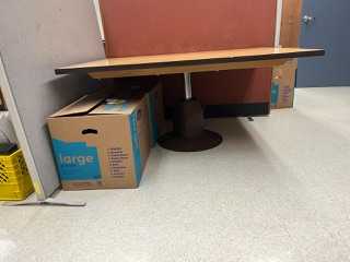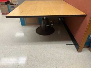 Large adjustable table. Width 60 inches; depth, 48 inches; height 29 inches. Table surface is in good condition. The table has a foot pedal under the surface to adjust the height. Currently this feature is not functioning, and would need repair. Pumping the pedal raises the table surface. Pushing up on the pedal locks the height in place.