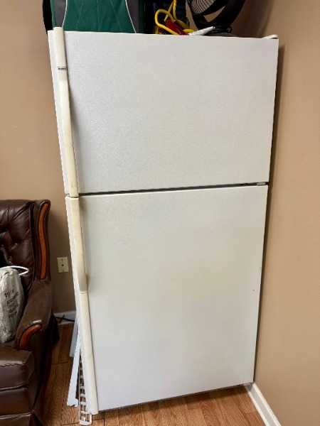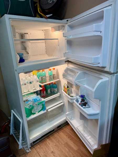 Freezer on top, clean, in good condition except for occasional water accumulation under crisper.