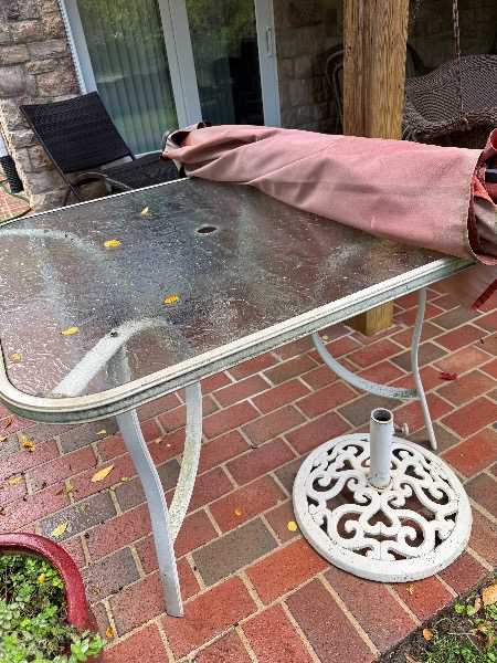 Older glass and metal table with 4 chairs, umbrella stand, and umbrella free for pick up. Some rust but very functional and could be cleaned up.