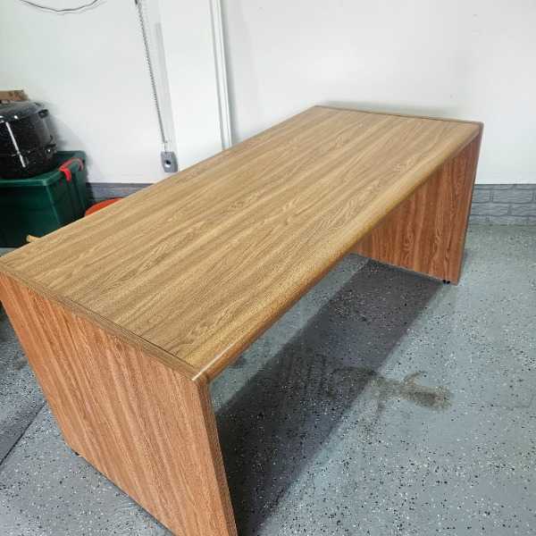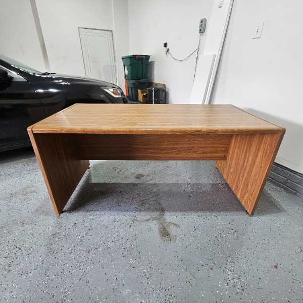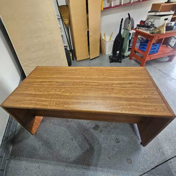 Large Desk. 61.5" (L) x 30" (D) x 29.5" (H). Laminate oak finish. Pickup in Canal Winchester. Item is heavy, requiring at least two people to load in vehicle.