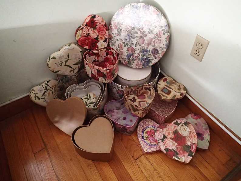 Fourteen decorative boxes ... two round (biggest is 14 inches across) and twelve heart-shaped (my late wife's surname was Valentine). Two plain cardboard ready for your own artistic embellishments; most with flowery themes. One nesting set of five (from 12" down to 4") with fabric covering and cushioned lids. Collapses down to five nested sets.