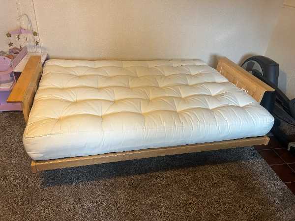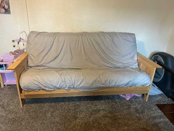 Solid wood futon with thick pad. The futon can be used as a couch or laid down flat as a full size bed. It is used so there are some dings/scratches and maybe some screws could be tightened, but it has worked great for us. We currently have it in our bonus room, but purchased a new couch recently and would like to replace the futon with the old couch. I like to keep a mattress pad and sheet on the futon pad at all times so I took pictures with the sheet on and of the pad itself. Pick-up only.