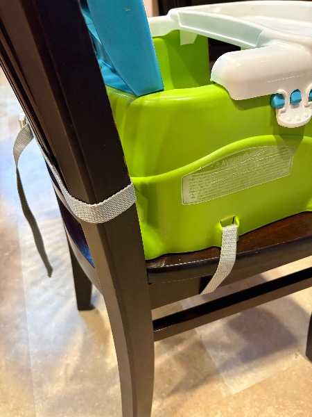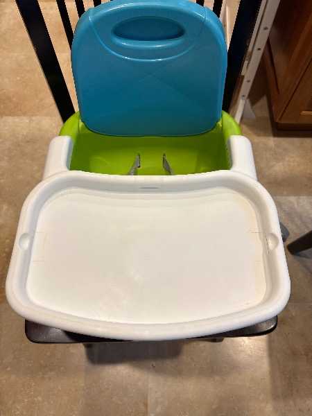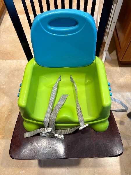 Strap-to-chair booster seat with removable tray. Straps wrap around back of chair and seat, and are secure even with a wiggly kid.