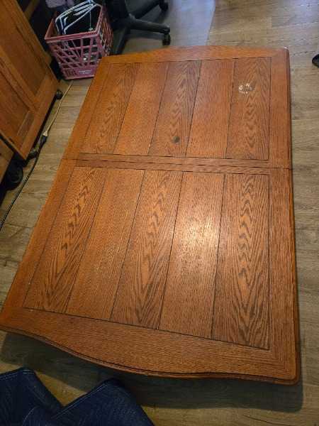 44x62 Dining Room Table with 6 chairs. Also has an 18 inch leaf to lengthen the table. Table is very sturdy. It shows some wear and it does have a glass ring stain near one corner. Some of chairs have random stains on seats. Free to good home. Table is pretty heavy. Will need 2 strong people. TABLE STILL AVAILABLE. NEED TO MOVE ASAP.
