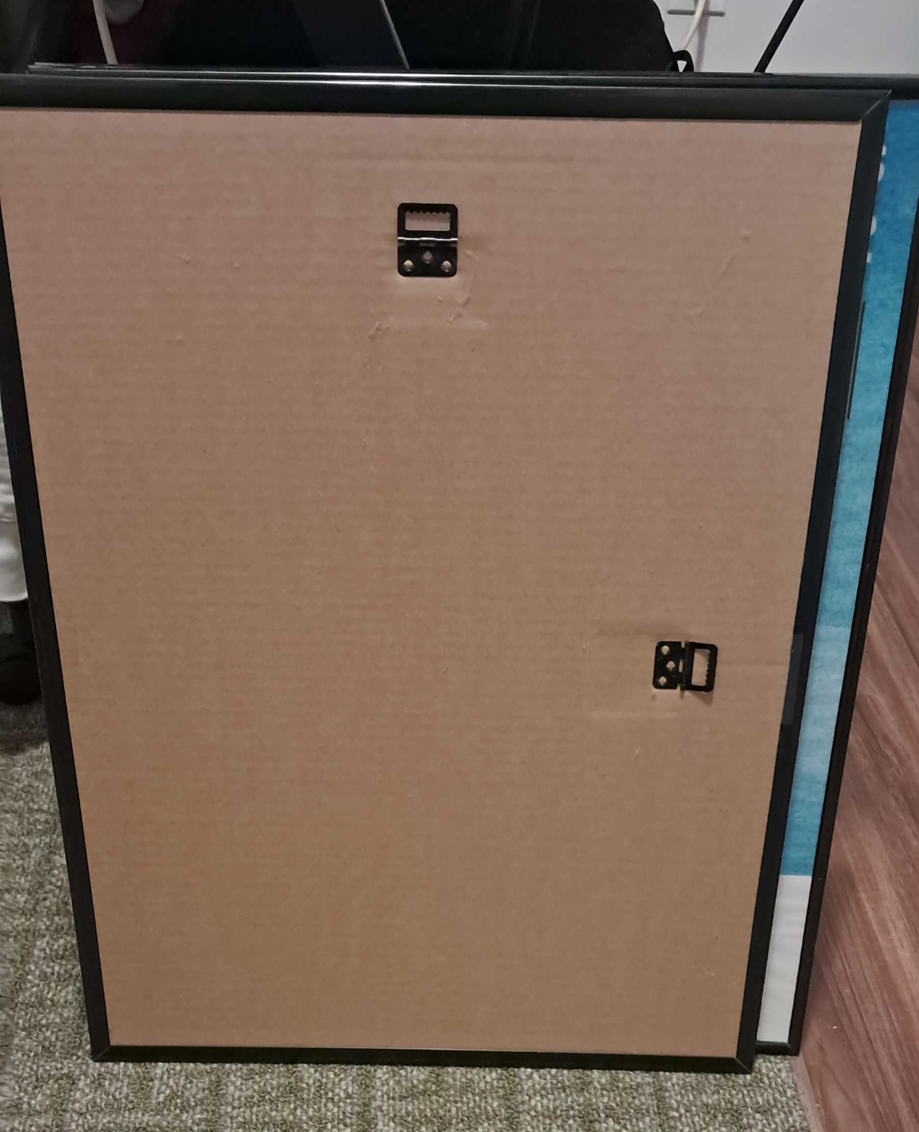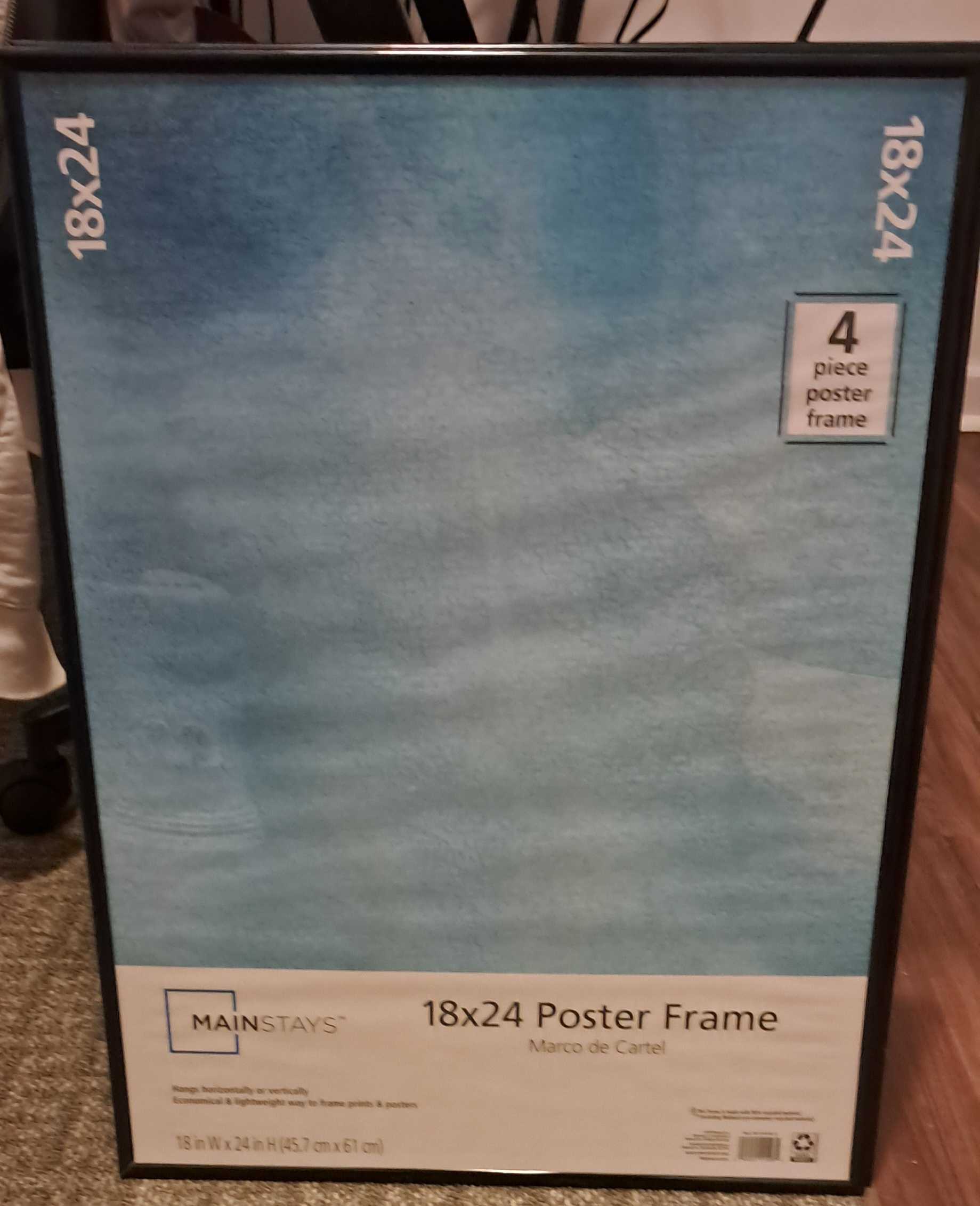 Three (3) 18" x 24" Walmart poster frames. You know the drill: cardbord backing with a hook for hanging; clear pastic cover, and four (4) black "frame" pieces. They've largely worked for me, but if you want these, you might use tape to keep the frame pieces from falling off (like they sometimes did). I can leave them outside for someone to pick up.