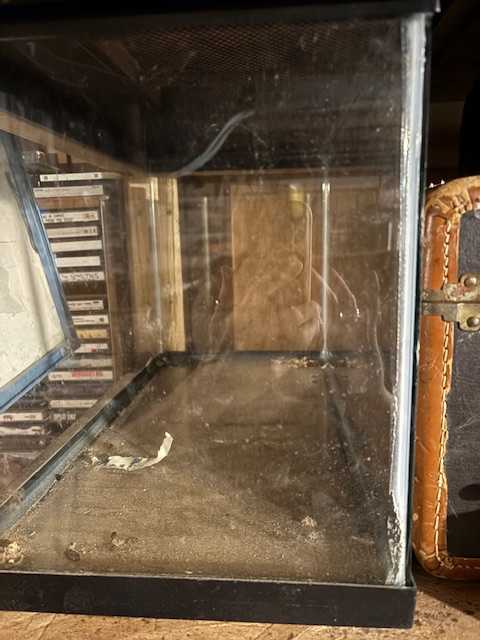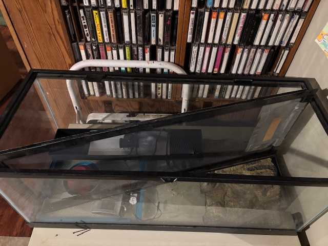 Two glass tanks, both used for nonaquatic pets (geckos and mice). Large one is apprx. 30" x 10.5" x 12" and the smaller one is 20" x 12" x 20". Large one comes with a tank divider and fake rock wall, thermometer and slightly damaged top. It did keep our gecko in. The small tank has a very sturdy metal wire cover. They might hold water, but we never tried.