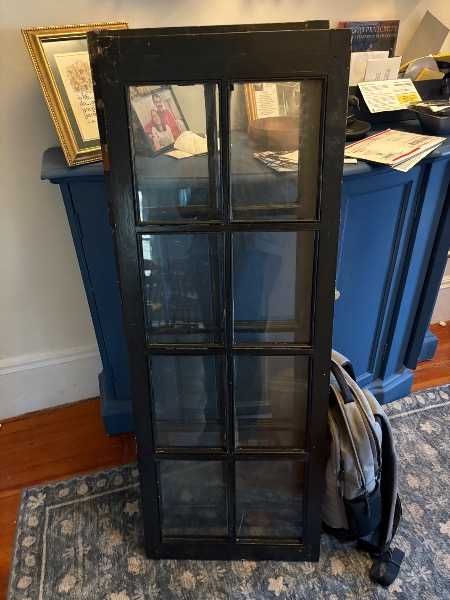 Pair of old wooden and glass doors for a cabinet. I got them from a neighbor a couple blocks away but alas they were a couple inches too big for my hutch. They're in good shape with I think the original hardware (hinges and latch)