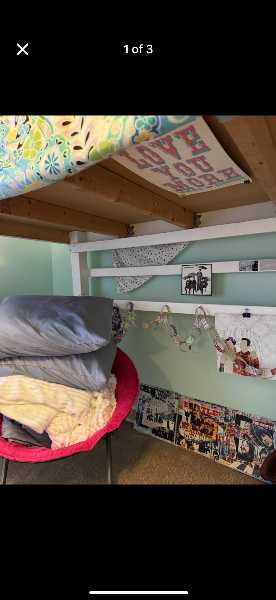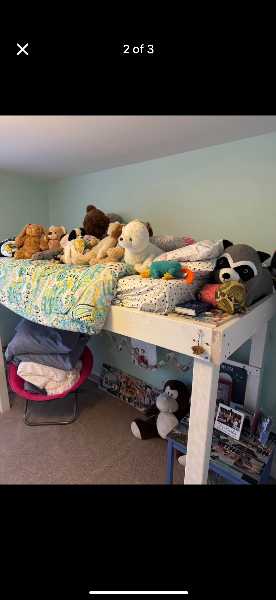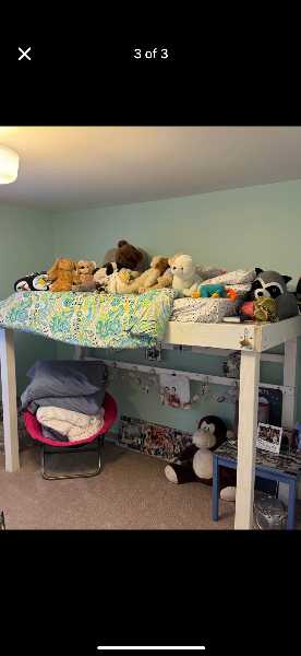 Twin size loft bed.  Free standing.  Hardware included.  Mattress available as well.