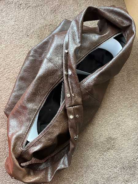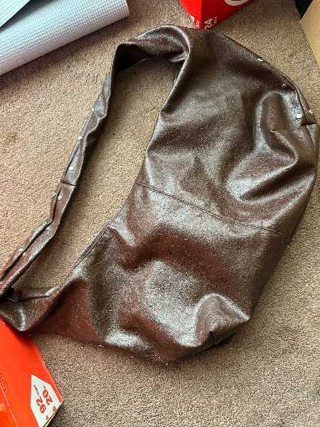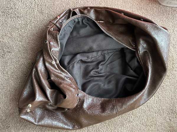 Chocolate color bag with small zippered pocket inside. Like new but the end of the zipper stitching came loose making the zipper pull to come off. The pull in now inside the inside pocket. A great find for someone who can do the repair.