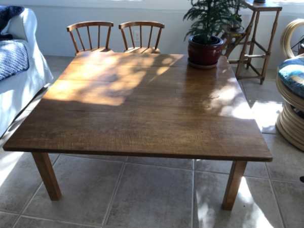 Solid maple, 40"x40"x16" table with 2 kids chairs. Very sturdy and well loved. Great for crafts, puzzles, games etc.  Has also been used as a coffee table on a casual lanai.