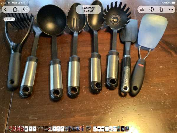Set of eight kitchen tools, including regular spoon, slotted spoon, Ladle, potato, masher, rubber scraper, pancake Turner, spaghetti strainer, meat, fork. Heat resistance to 400°F.