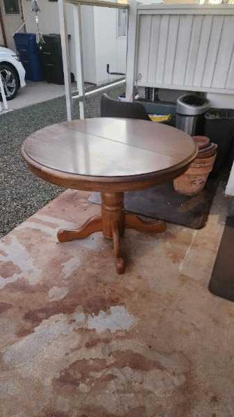 Beautiful table that looks round but you can add the two leaves to make it oval and bigger. No chairs available