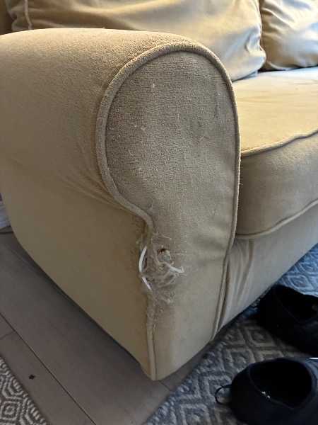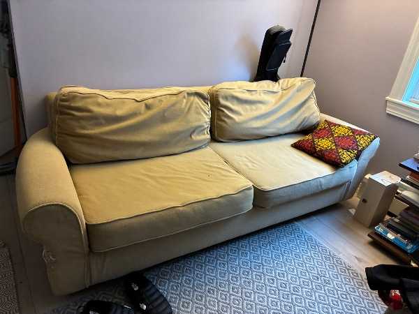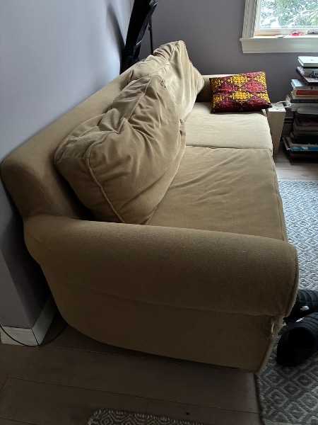 7' x 3' x 2' sofa. Very comfortable, no stains and cushions in good condition, but some damage on front "leg" from cat scratch. Over 10 years old, but barely used and still very comfy.