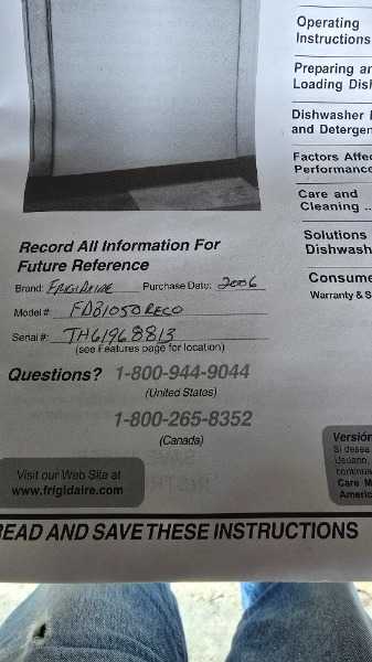 2006 Frigidaire FDB1050REC0 stainless steel, Working when removed, has a slightly damaged control panel start switch but does not prevent operation. The tableware basket has some bits missing from the bottom but this can be remedied easily. Does a good job of cleaning. Free of course.