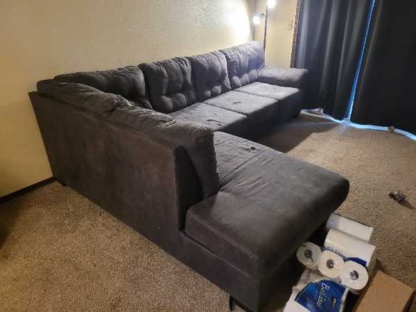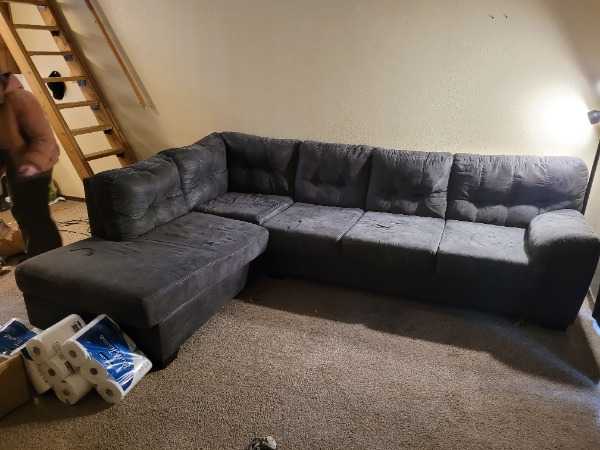 Large sectional, some small discolored spots, but nothing agregeious.  Still comfy.