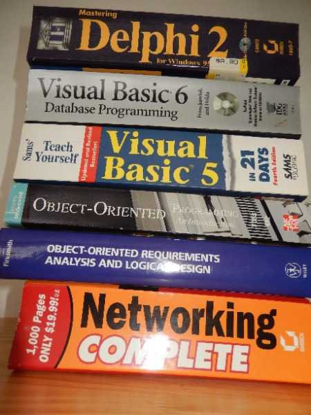 Mastering Delphi 2, Visual Basic 6 Database Programming, Visual Basic 5 in 21 Days, Object-Oriented Programming An Introduction, Object-Oriented Requirements Analysis and Logical Design, Networking Complete.  Take 1 or all.  Easy porch pickup.