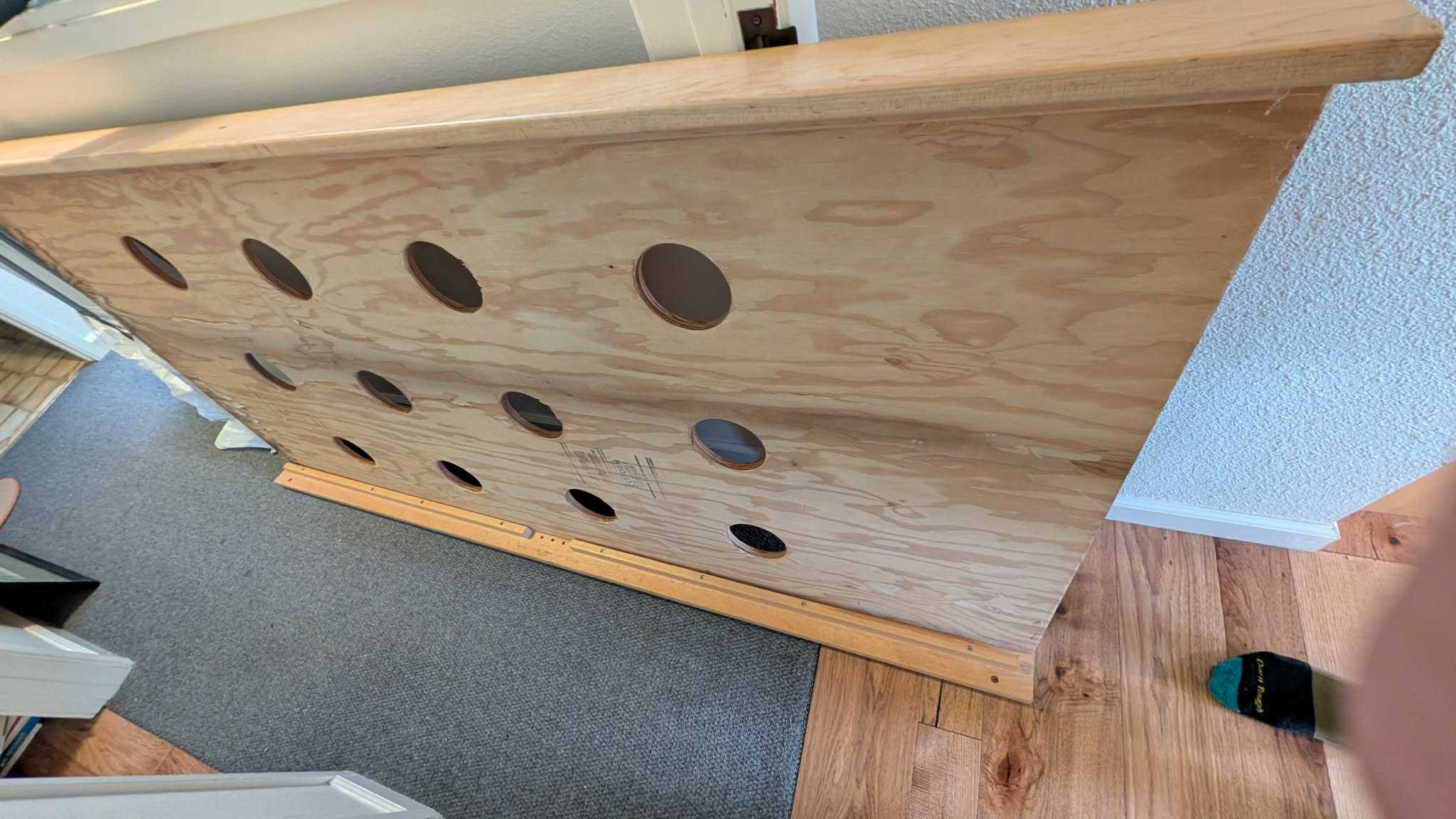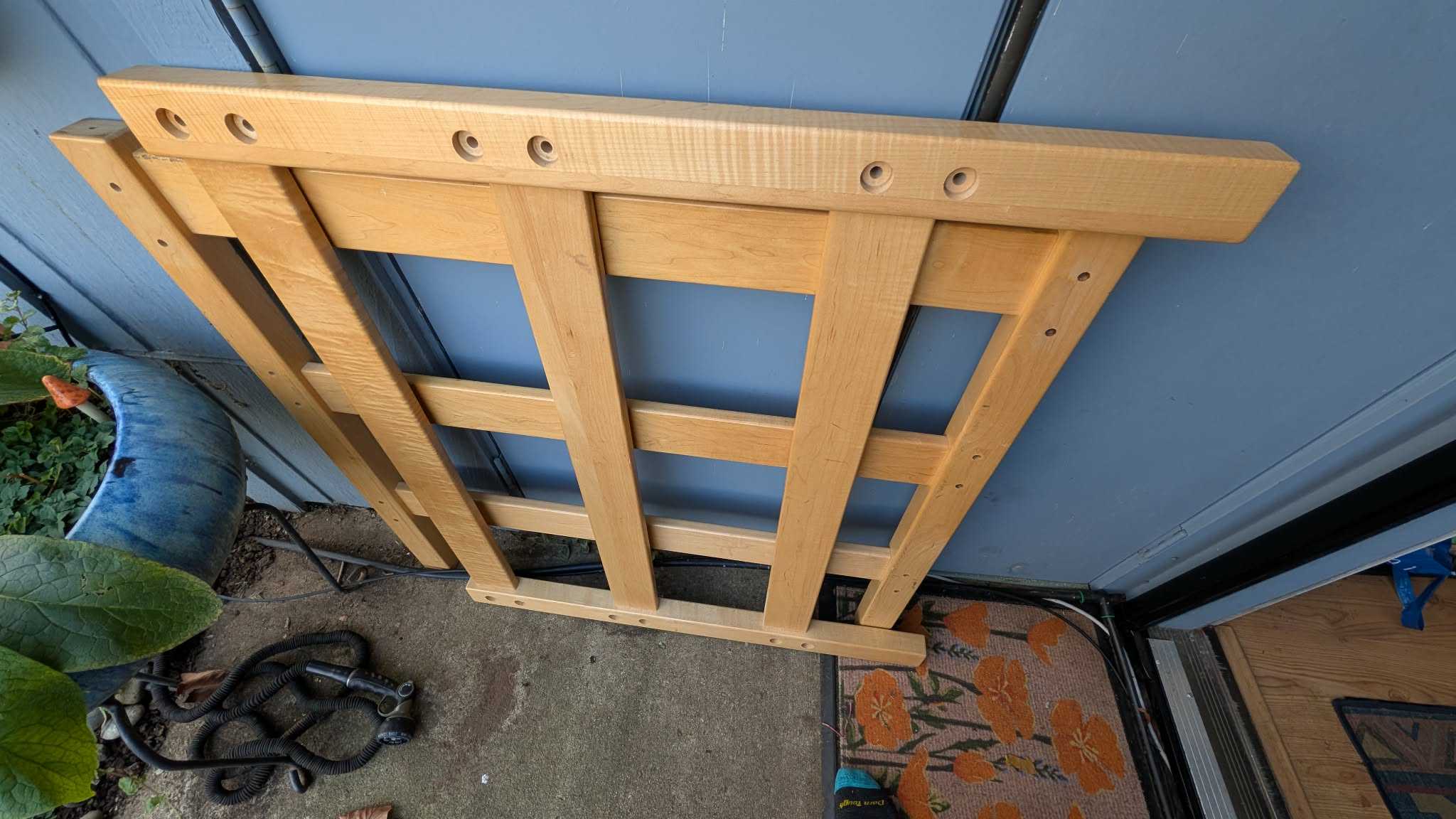 Wooden Extra Long twin bed frame. Mattress not included. Slight water damage at the foot/head of bed, does not affect structural integrity.