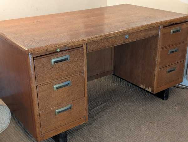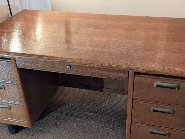 Vintage 1940s Oak Desk. Beautiful vintage desk from the 1940s by Gunn Furniture Co. Made of solid oak with great craftsmanship. I did not refinish or even polished prior to pictures, so some attention will really make this shine. The desk features: 5 drawers total. Left side: 1 regular drawer + 1 file drawer. Right side: 3 regular drawers. A pull-out shelf on each side. Original drawer pulls and dovetail construction. The finish is in good condition with some age-appropriate wear that adds to its character. Dimensions: 58" L x 32" D x 29.5" HLOCAL pickup only — please bring at least two people to move it.