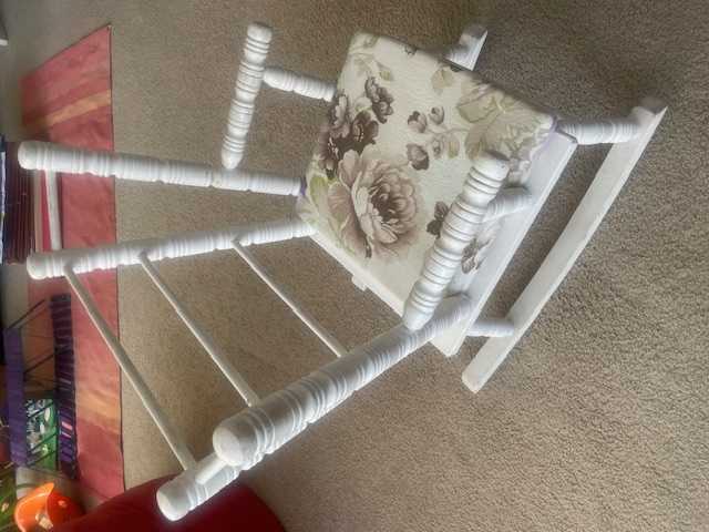 We bought this at an antique store in the Central Valley some years ago, it's great for a 5-8 year old. We got the cushion (upholstery sponge) made with a cotton fabric cover which is not removable. Smoke free home, no pets.