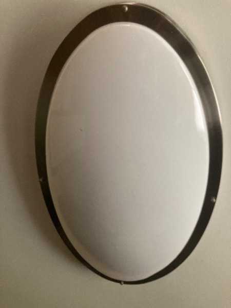 Flush mount oval kitchen light with a nickel finish. The plastic light cover is cracked, but you can conceal it easily. It is approximately 32 inches in width and the plastic cover is about 31 inches. It takes 2 Circline Tubelights which I will include. Please respond with pickup plans.