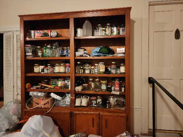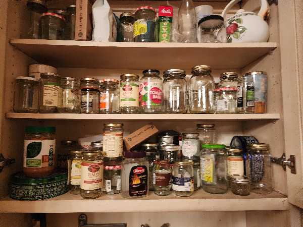 I have a large number of glass jars, mostly bottles from purchases at local grocery stores. These are mainly soup, jelly/preserves, pickles, etc. They are mostly screw on lids, not sealing lids used in home preservation processes. Pictures show two cabinets nearly filled with these jars. Take as many as you want. Check with me before coming to see how many remain available.
